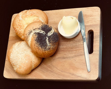 A crusty white bread roll tied in a decorative knot. It comes in a variety of toppings and make great burger buns. These are a large bun at about 125grams each