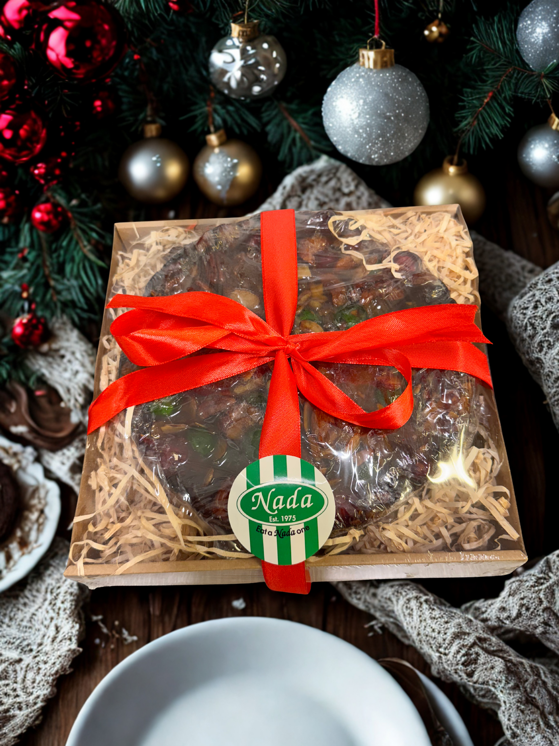 1500 grams of our premium aged rich fruit cake. Topped this with a selection of nuts and glaze fruit making it one special cake packaged beautifully for a gift or your Christmas table.
